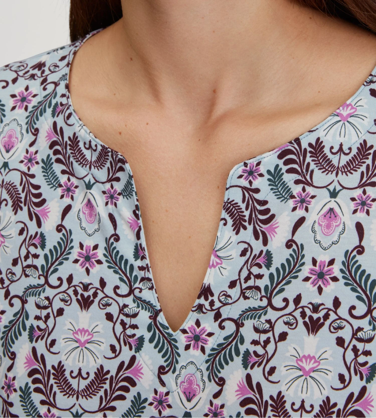 Vêtement de nuit qui allie élégance nordique et confort raffiné. Confectionnée en 100 % coton interlock swiss+cotton, elle est douce et soyeuse au toucher, respirante et parfaite pour les nuits plus fraîches. L’imprimé muguets suédois sur un bleu fumé lui donne une touche de poésie subtile, tandis que sa longueur de 100 cm et ses manches longues garantissent une agréable couverture.