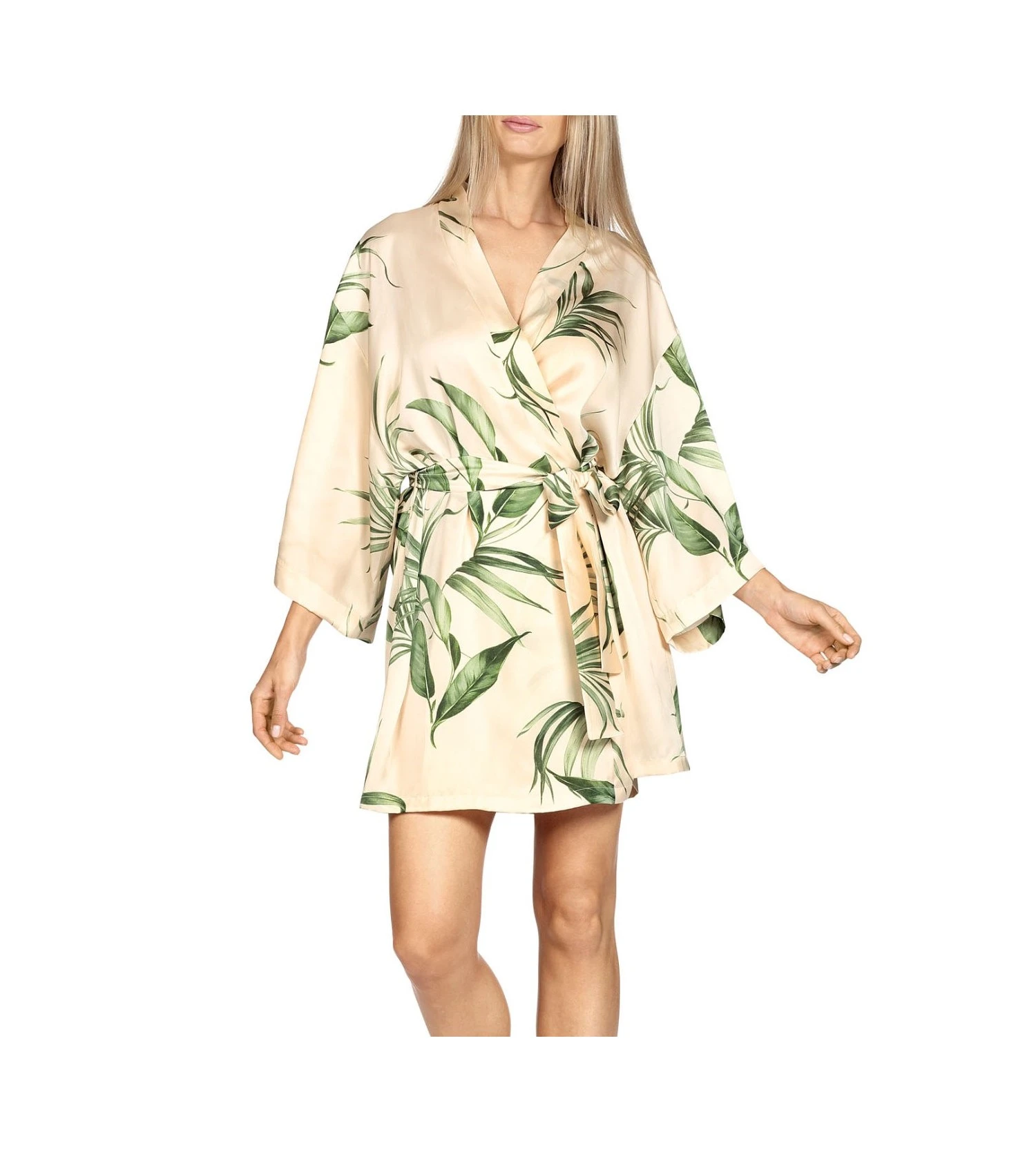 Superbe déshabillé Coemi en satin, sublimé par de superbes manches longues évasées. Sa forme Kimono ajustée très sensuelle s’arrête au-dessus du genou et se ferme joliment grâce à la ceinture de satin assortie.