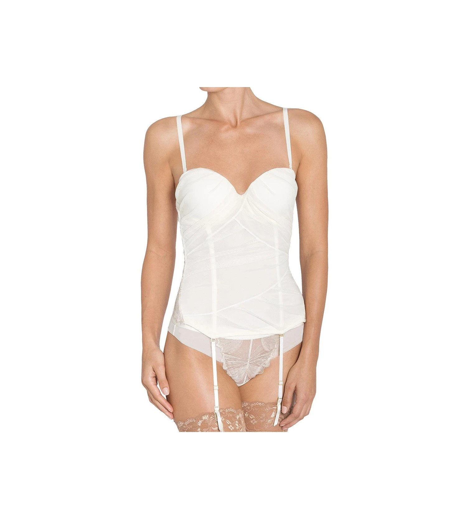 Avec la ligne Splendid Essence, Triumph a conçu les dessous idéaux à porter avec la robe de mariée de vos rêves. Le corsage Splendid Essence en tulle travaillé à la main et en dentelle florale dessine votre silhouette en douceur. Bonnets légèrement rembourrés avec effet sculptant sans volume supplémentaire et avec armatures intégrées. Bretelles amovibles, réglables en longueur, s’attachent également en tour de cou, en diagonale ou croisées. En qualité épaisse et apportant un soutien, avec des baleines sur le devant et les côtés pour des formes idéalement modelées. Quatre jarretelles amovibles en qualité élastique soyeuse, réglables en longueur et sans nickel.