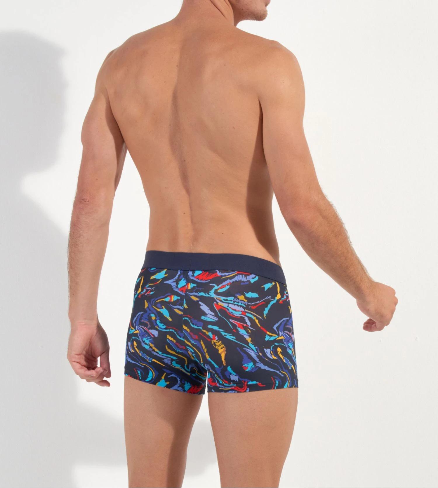 BALI : un beau bleu marine orné d’un imprimé tout en mouvements et en couleurs. Des motifs de vagues et d’ondes conjuguant des coloris éclatants comme le jaune, le rouge, le bleu turquoise donnent un style très peps à ce sous-vêtement pour hommes. Un design souligné par la ceinture bleue marine ornée du logo HOM.