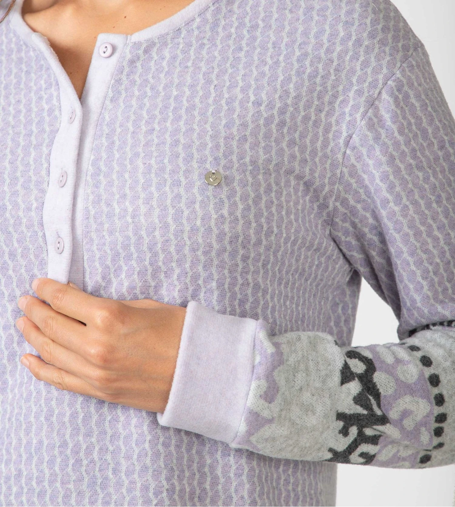 La liquette Massana lilas en polaire enveloppe la silhouette de douceur et de chaleur. Son imprimé en jacquard lui confère un style cocooning, parfait pour les soirées d’hiver.
