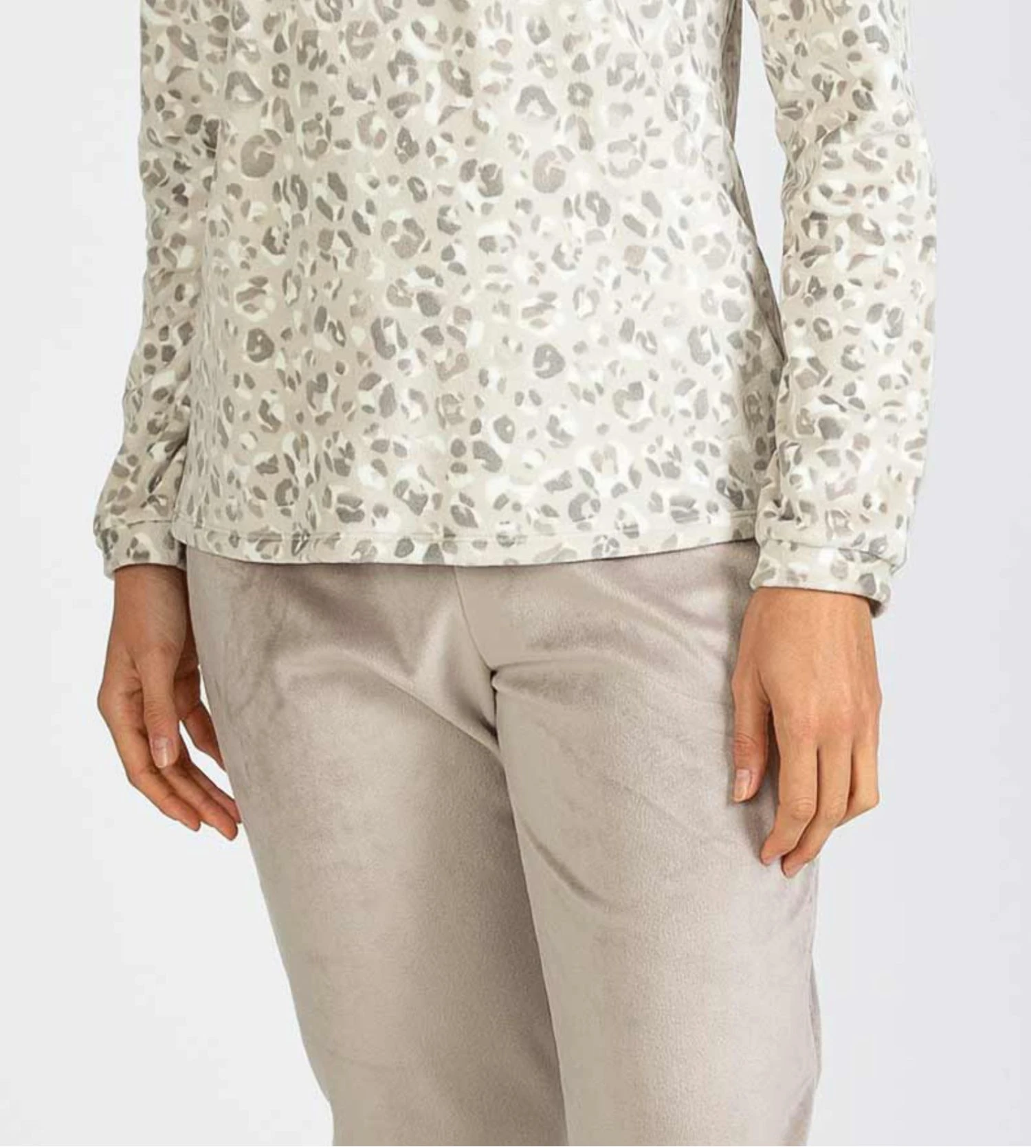 - Haut à manches longues beige imprimé léopard.