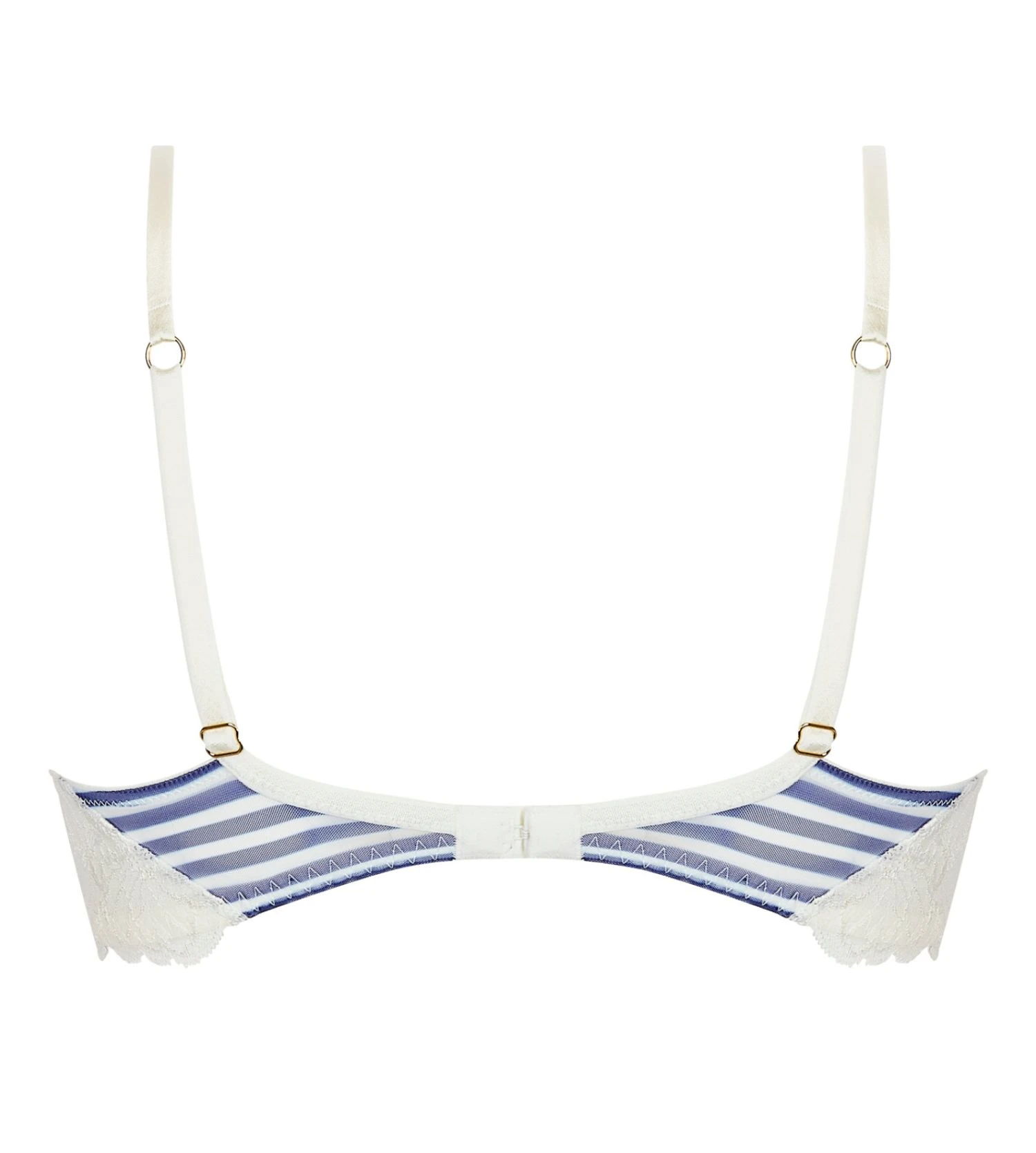 Le soutien-gorge push-up Cap au Levant de Lise Charmel sublime le décolleté avec raffinement. Sa coupe ampliforme recentre et galbe la poitrine pour créer un volume naturellement arrondi. Le tulle rayé marine et blanc, inspiré du style nautique, se pare de broderies florales en transparence pour une allure romantique et graphique.