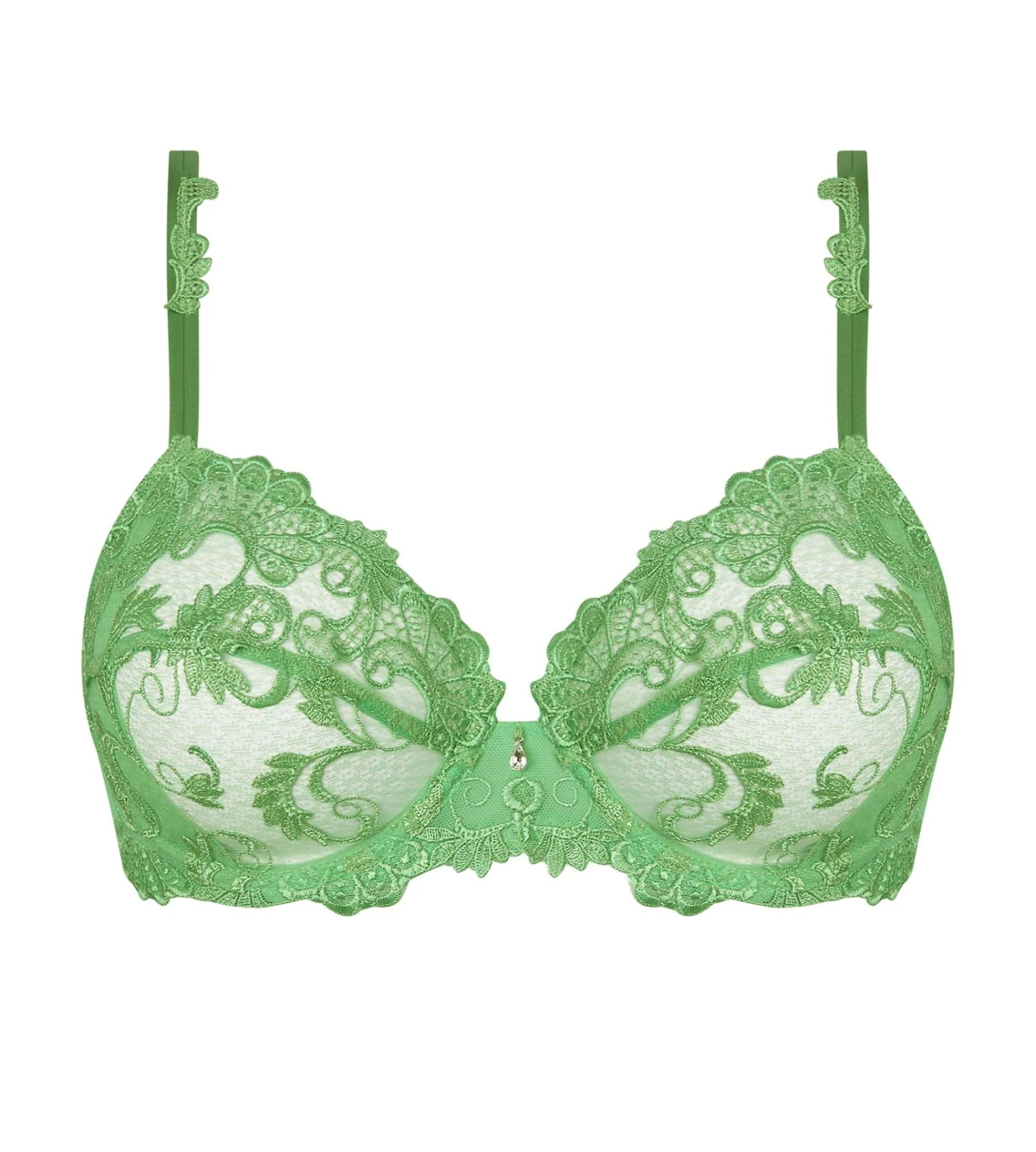 Soutien-gorge Dressing Floral haute couture égayé d’un dessin spectaculaire réalisé en point guipure sur de la lingerie tendance et élégante. Style chic d’inspiration Art Déco tout en douceur et transparence, relevé d’un bijou scintillant.
