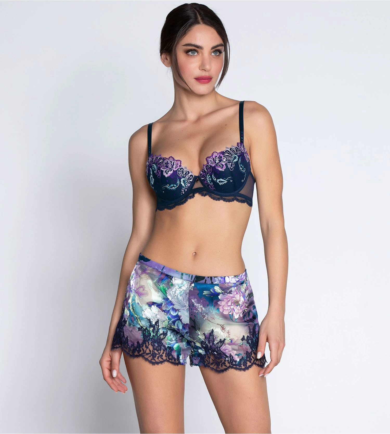 La collection Déesse Désirs s’inspire des somptueuses étoffes et broderies d’Asie centrale, évoquant un voyage onirique sur les Routes de la Soie. Les motifs luxuriants, notamment des fleurs d’iris, sont magnifiés par des broderies délicates et des fils scintillants, ajoutant une touche de lumière subtile. La palette de couleurs exprime mystère et magie, tandis que les matières nobles comme la soie dévorée et la dentelle Leavers apportent légèreté et élégance.